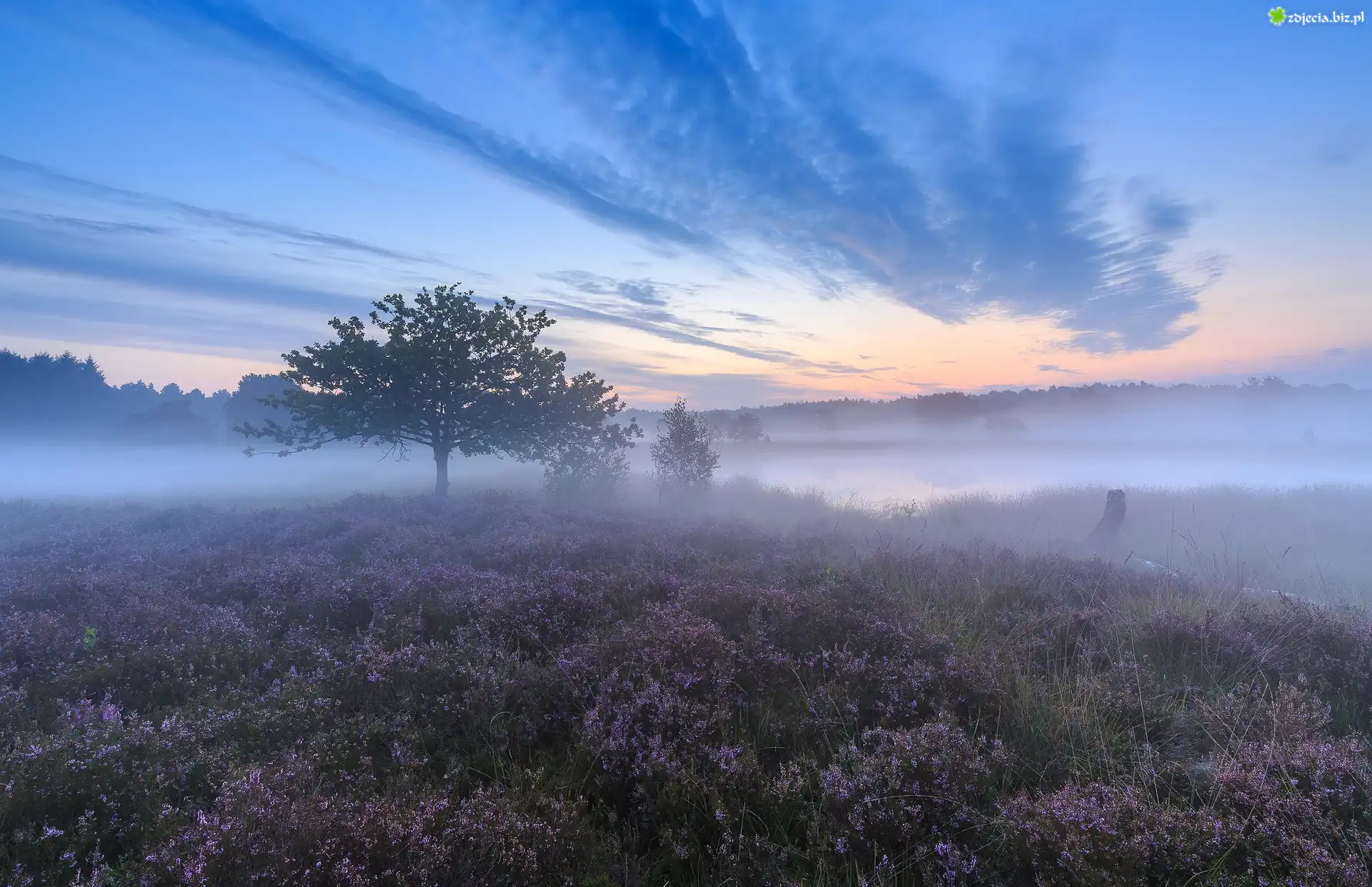 Zdjęcie Jesień, Mgła, Pole, Wrzosowisko, Wrzos, Drzewa