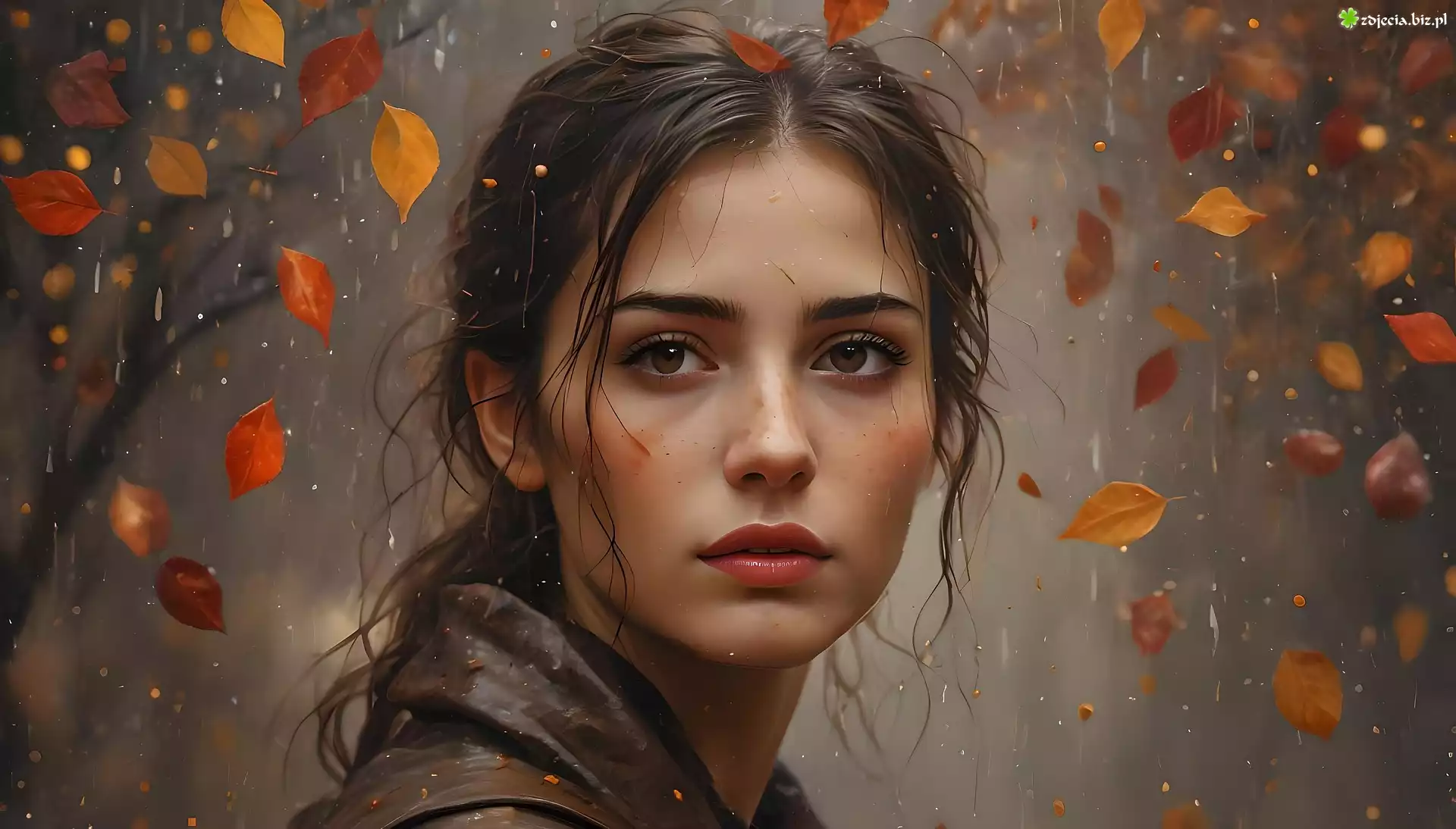 Zdjęcie Kobieta, Jesienne, Liście, Deszcz, Grafika