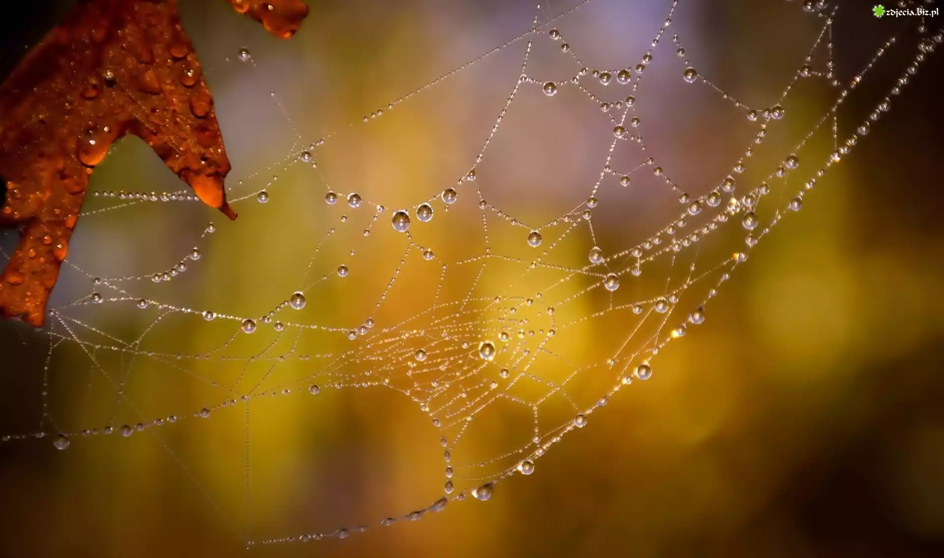 Zdjęcie Jesienny, Liść, Pajęczyna, Krople, Makro