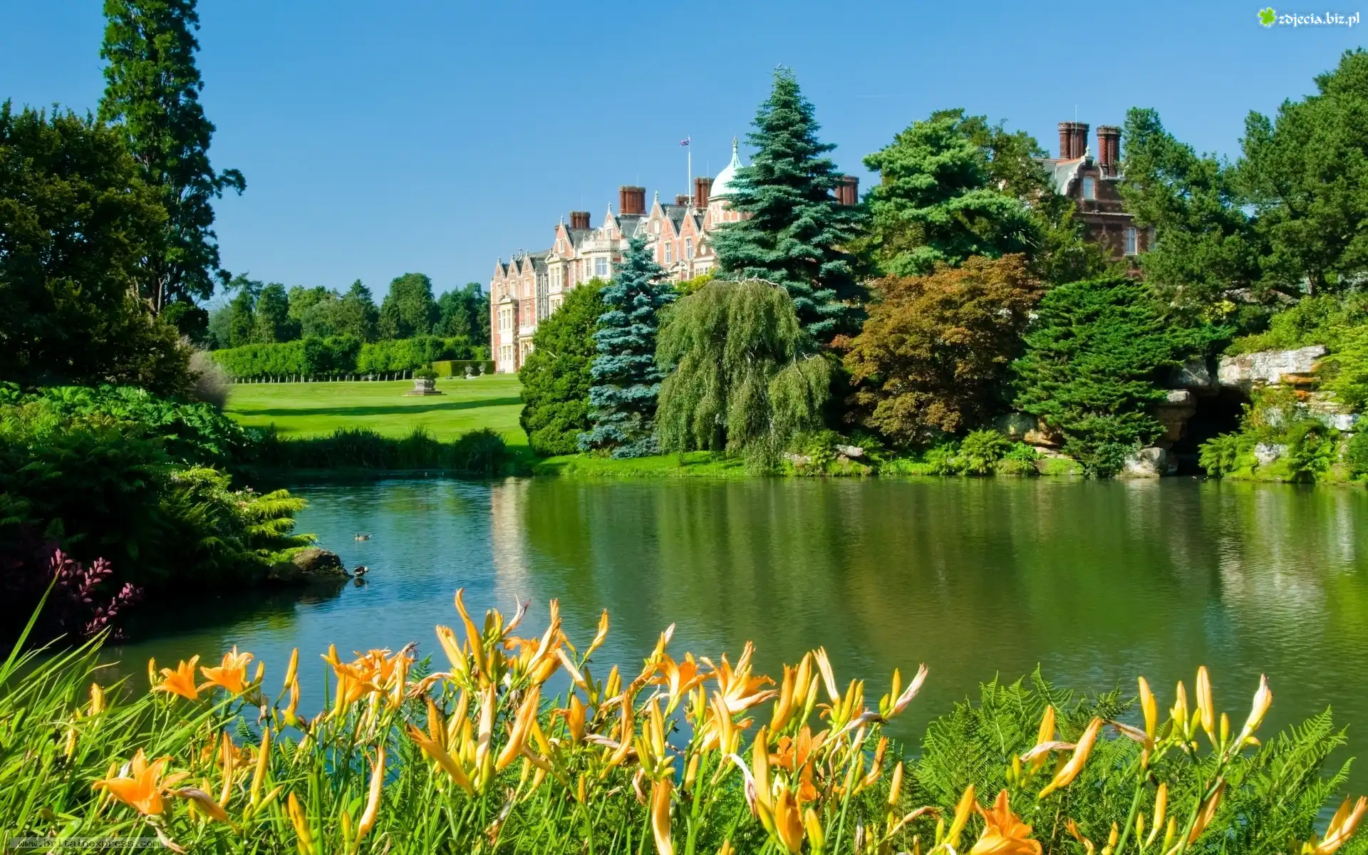 Zdjęcie, Jeziorko, Kwiatki, Drzewa, Pałac, Sandringham, Anglia