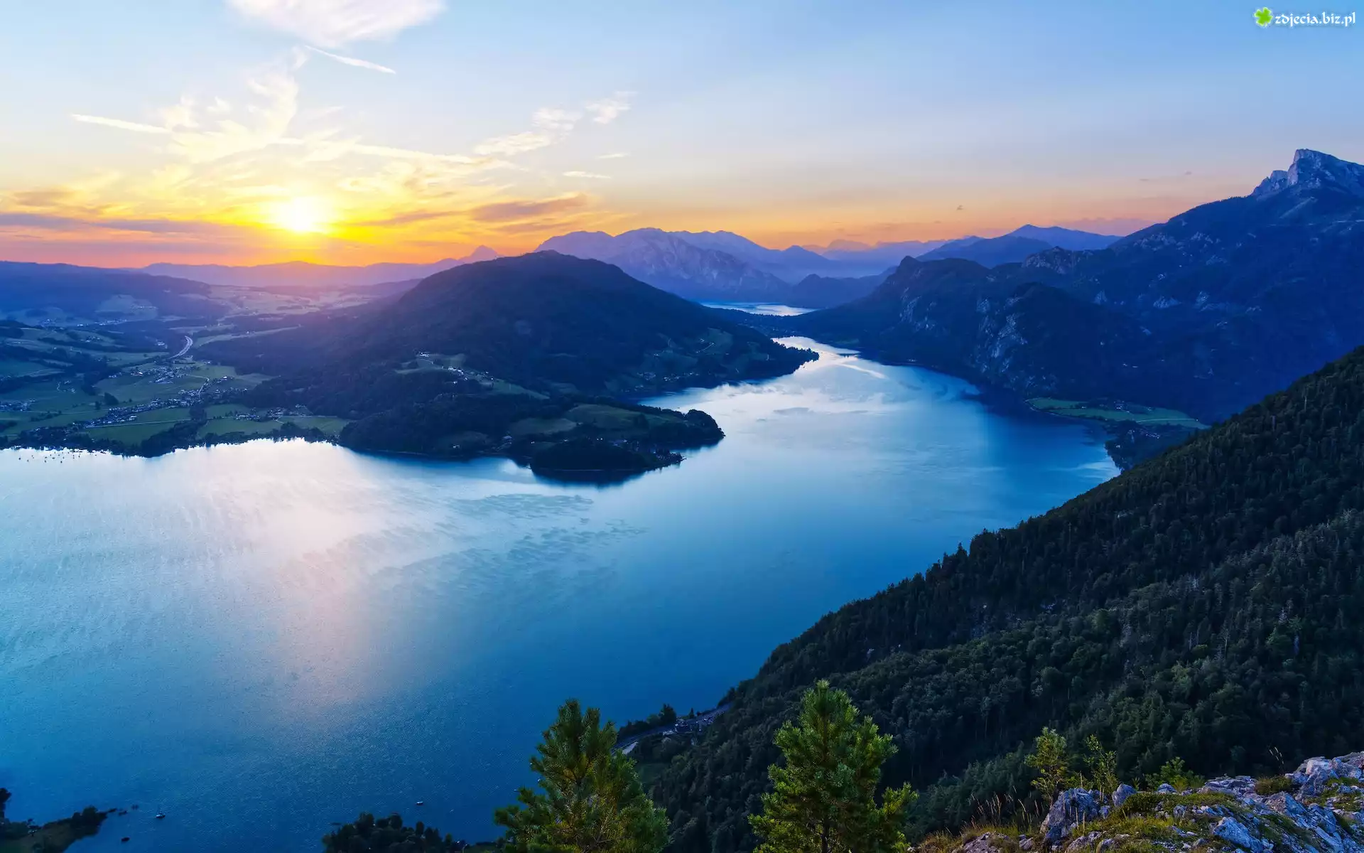 Zdjęcie, Austria, Góry, Alpy, Jezioro Mondsee, Wschód słońca