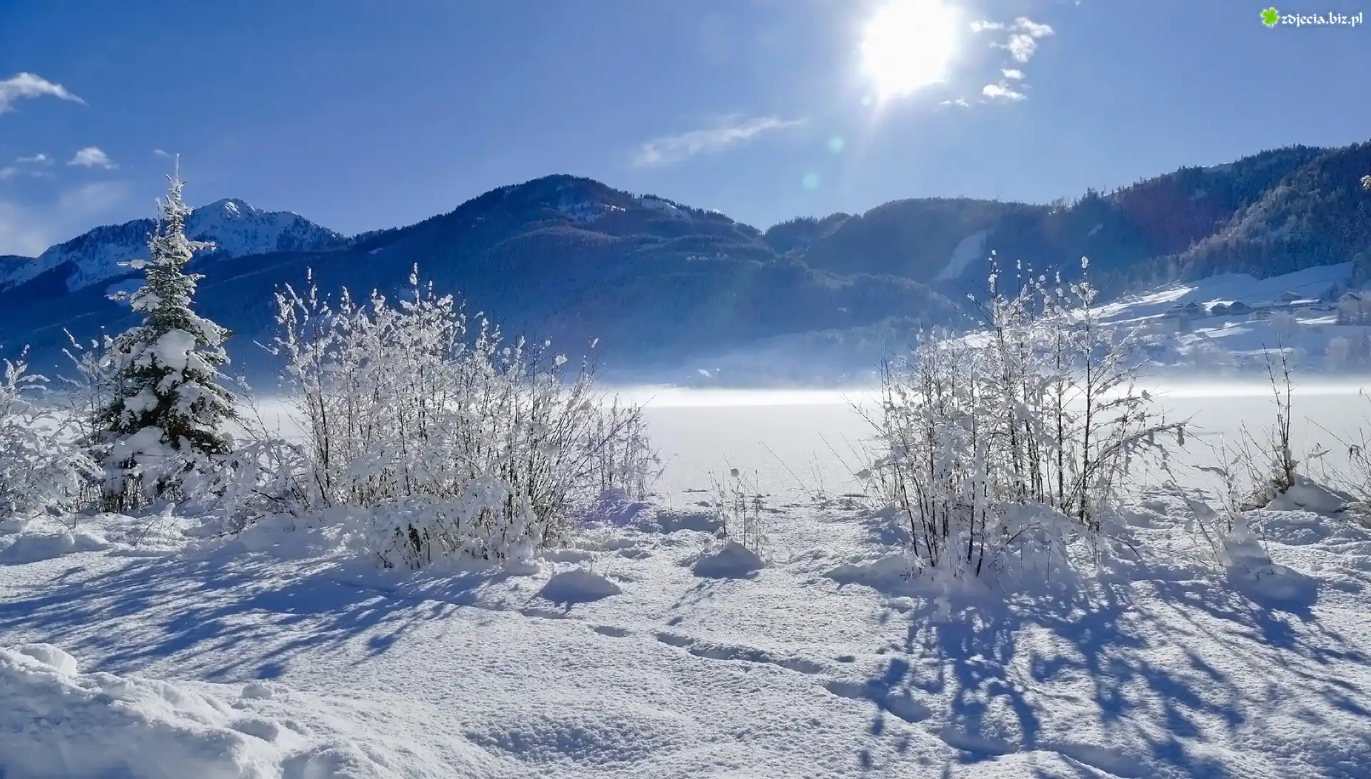Zdjęcie Austria, Karyntia, Alpy Gailtalskie, Jezioro Weißensee, Zima, Krajobraz, Góry, Promienie słońca, Drzewo, Krzewy |