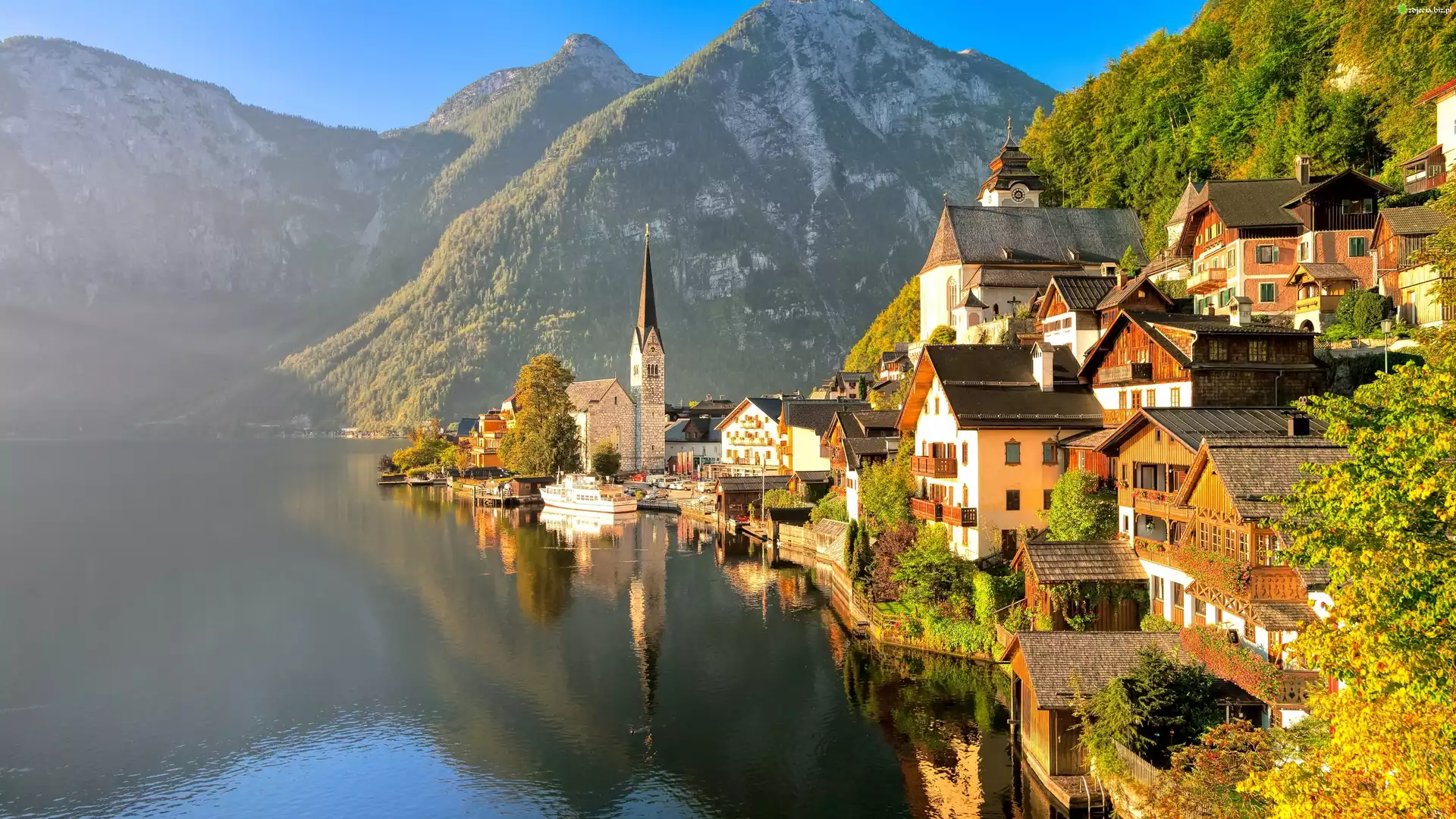 Zdjęcie, Jezioro, Góry, Hallstatt, Austria, Jesień