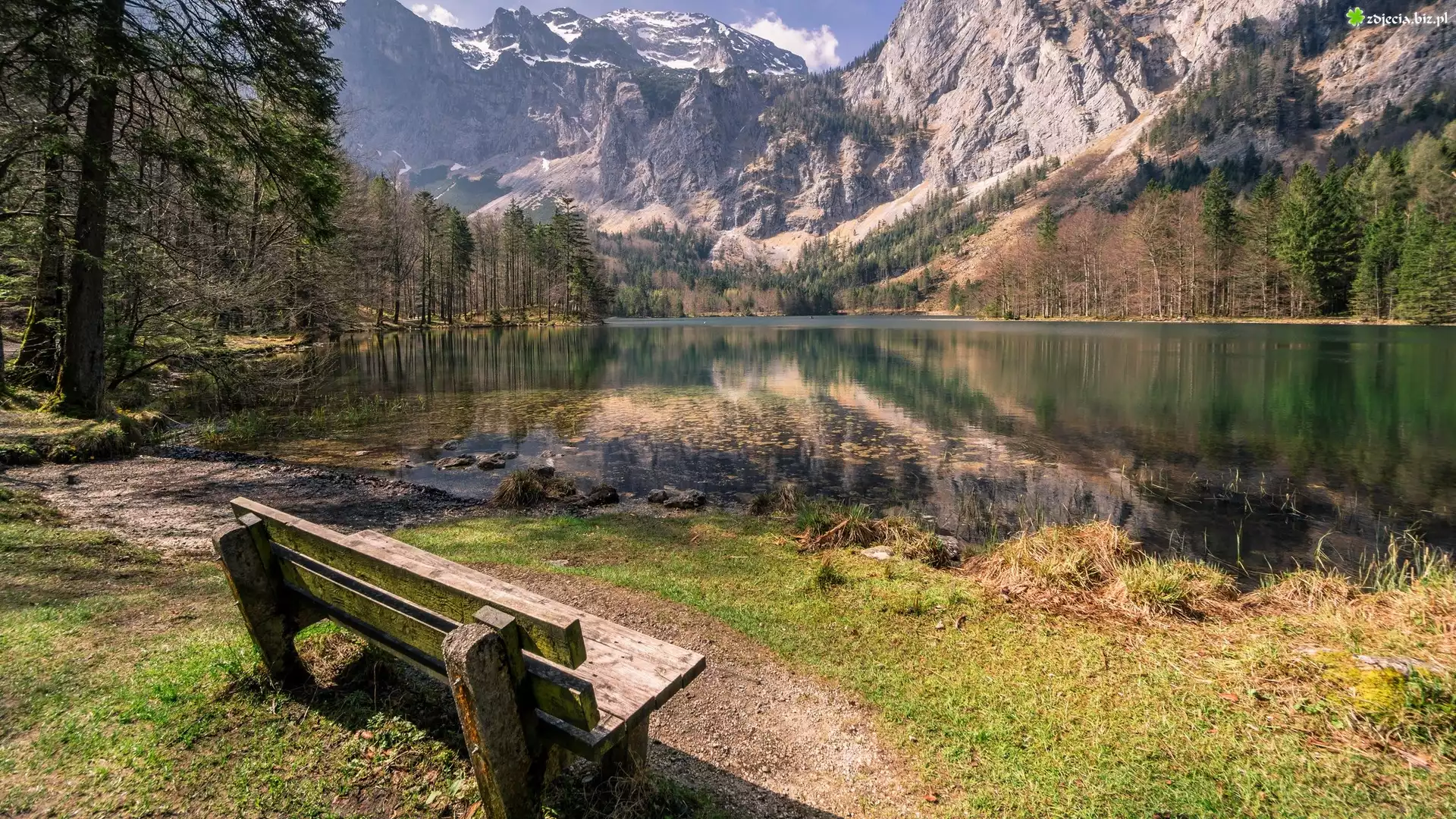 Zdjęcie Austria, Jezioro Hintere Langbathsee, Góry Alpy, Drzewa, Ławeczka