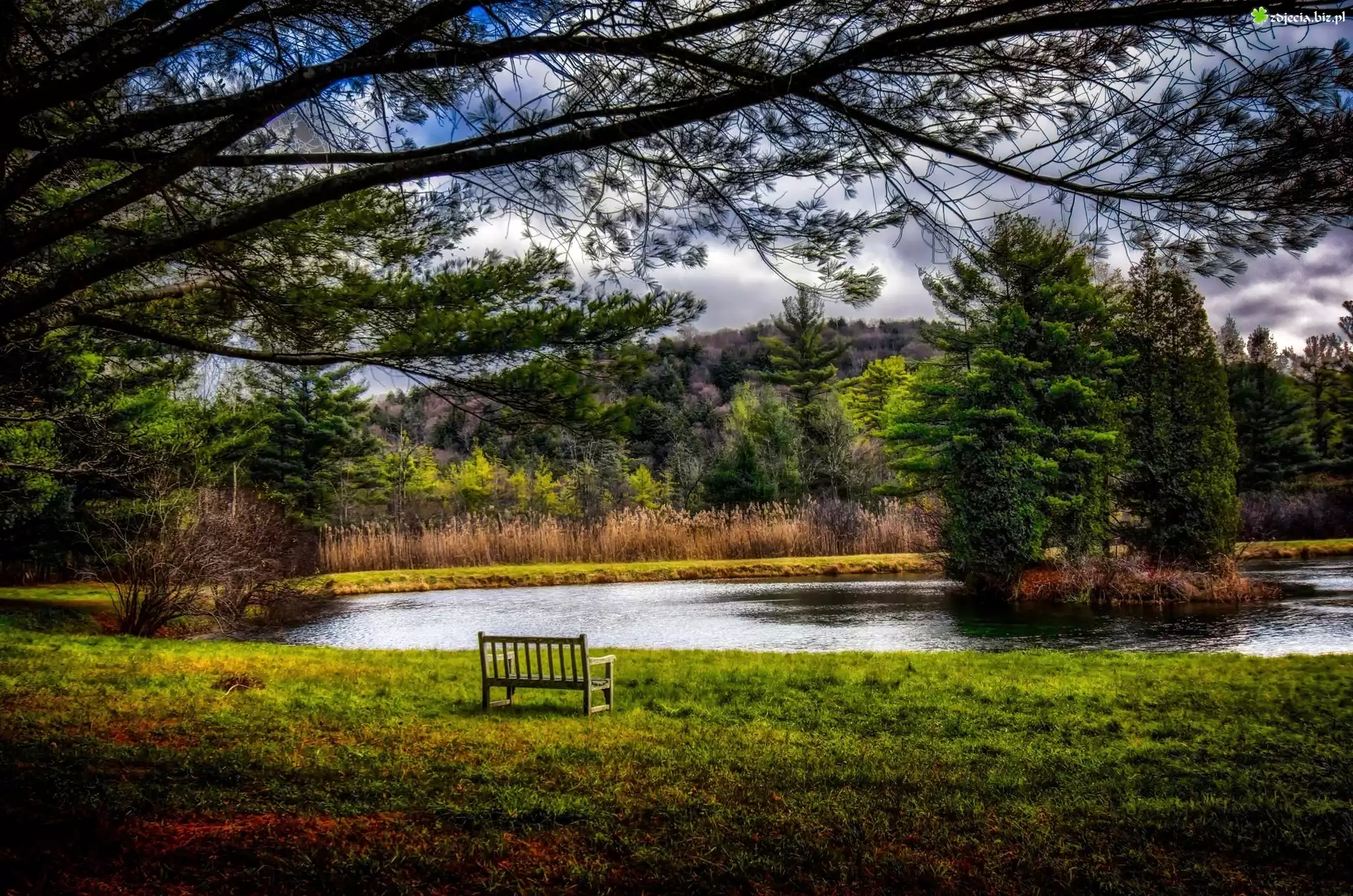 Zdjęcie Jezioro, Lasy, Drzewa, Ławka, Krajobraz