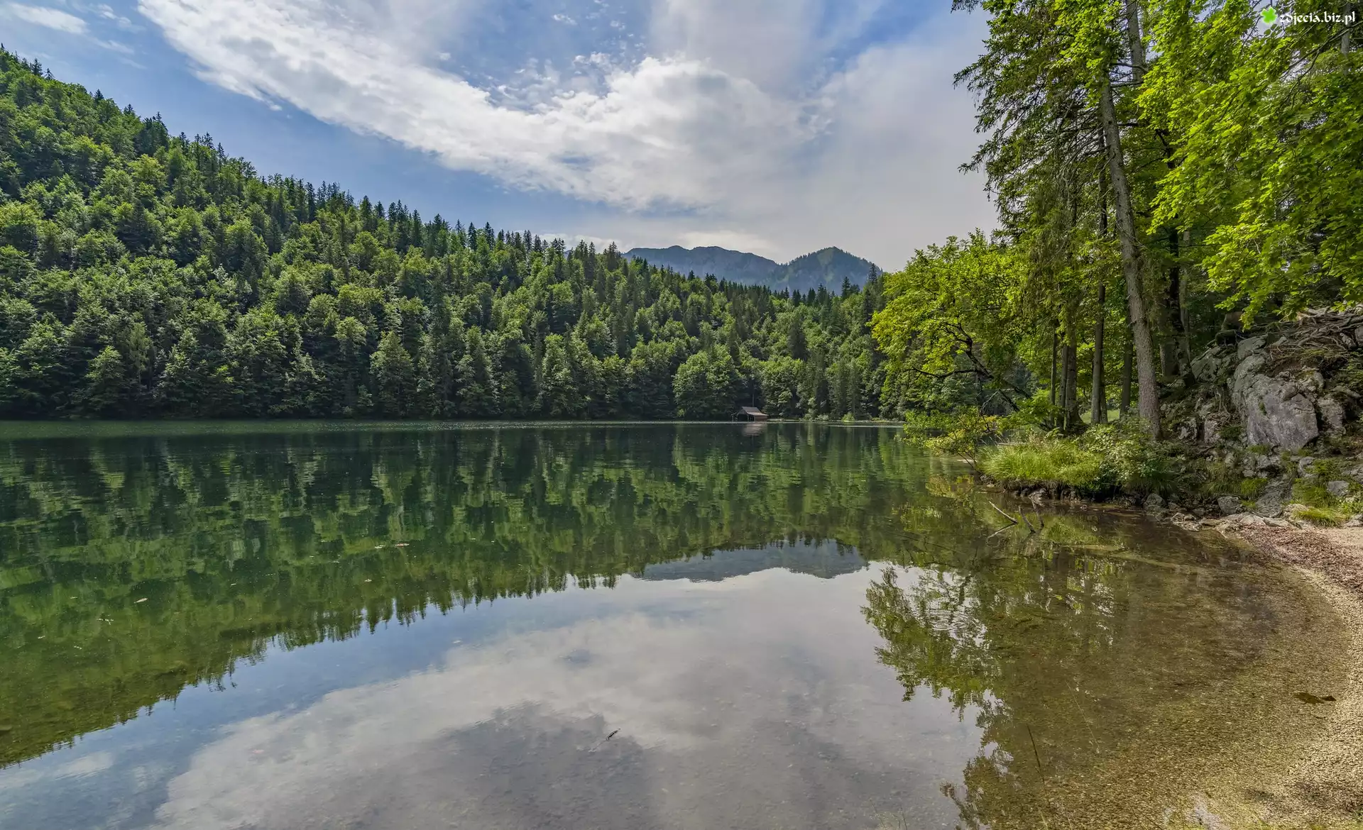 Zdjęcie Jezioro, Toplitzsee, Brzeg, Las, Drzewa, Góry, Alpy, Odbicie, Chmury, Austria