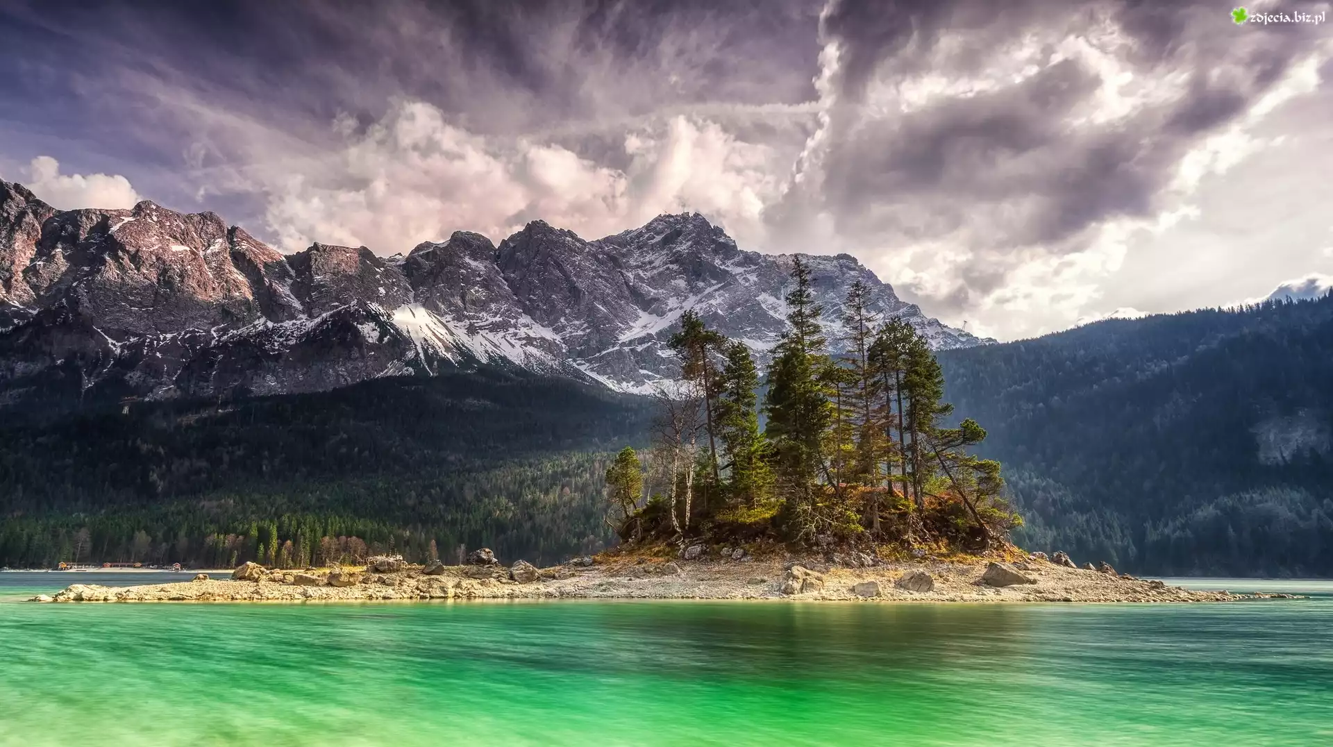 Zdjęcie Jezioro, Góry, Drzewa, Chmury, Wysepka