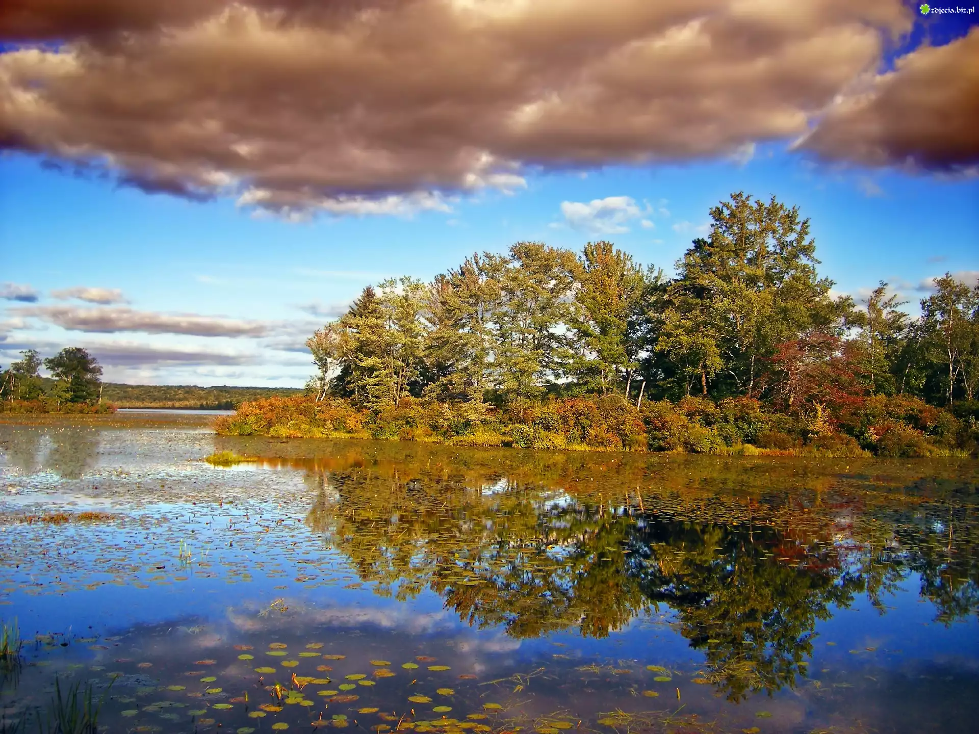 Zdjęcie Jezioro, Drzewa, Chmury, Jesień