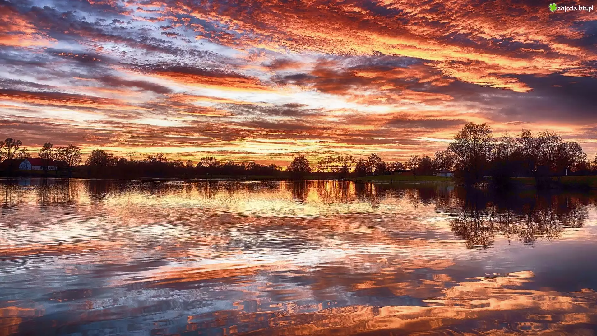 Zdjęcie Jezioro, Drzewa, Domy, Kolorowe, Niebo, Odbicie, Chmury, Zachód słońca