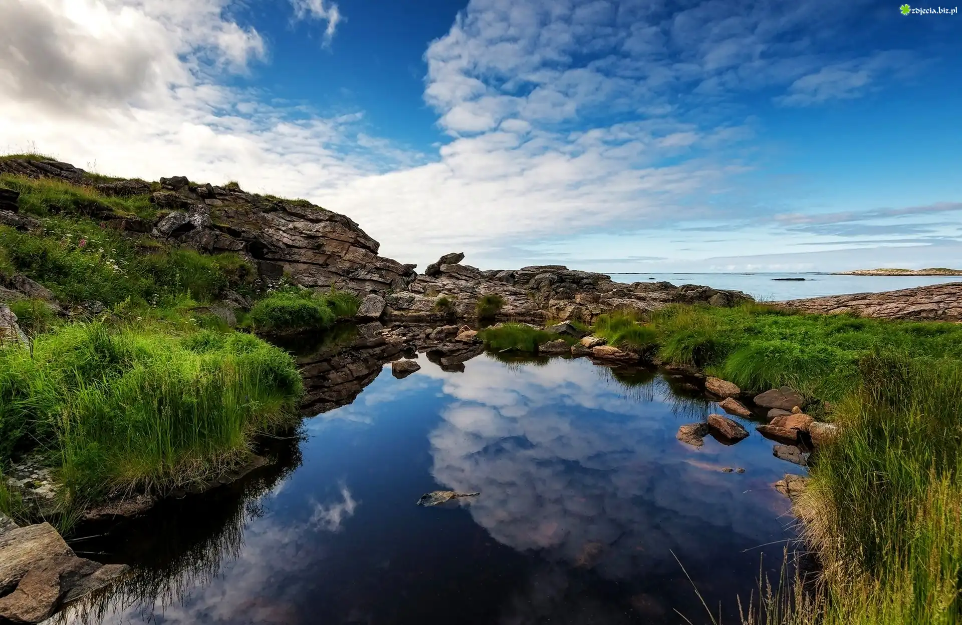 Zdjęcie Jezioro, Skały, Chmury, Odbicie