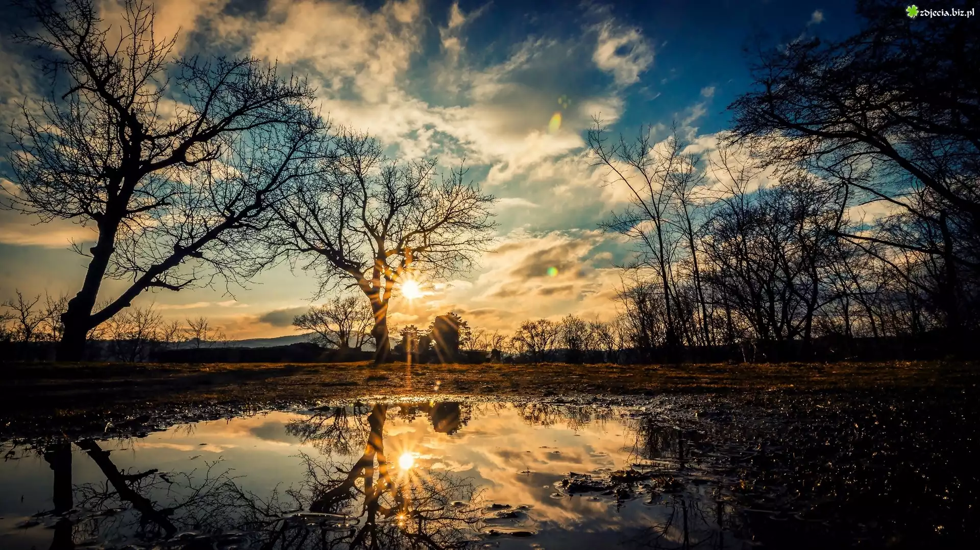 Zdjęcie Jezioro, Zachód, Słońca, Chmury, Drzewa