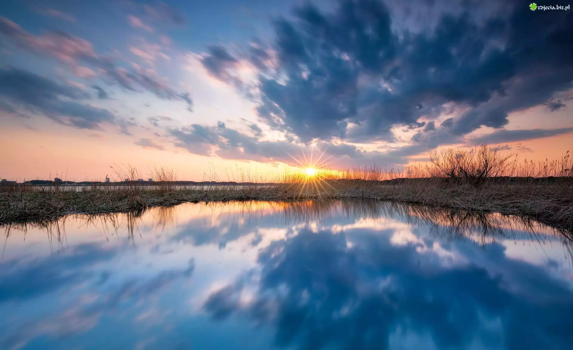 Zdjęcie Jezioro, Zachód słońca, Chmury, Roślinność