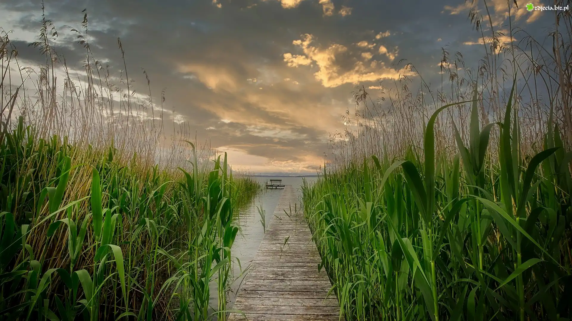 Zdjęcie, Jezioro, Pomost, Wschód słońca, Chmury, Trzcina