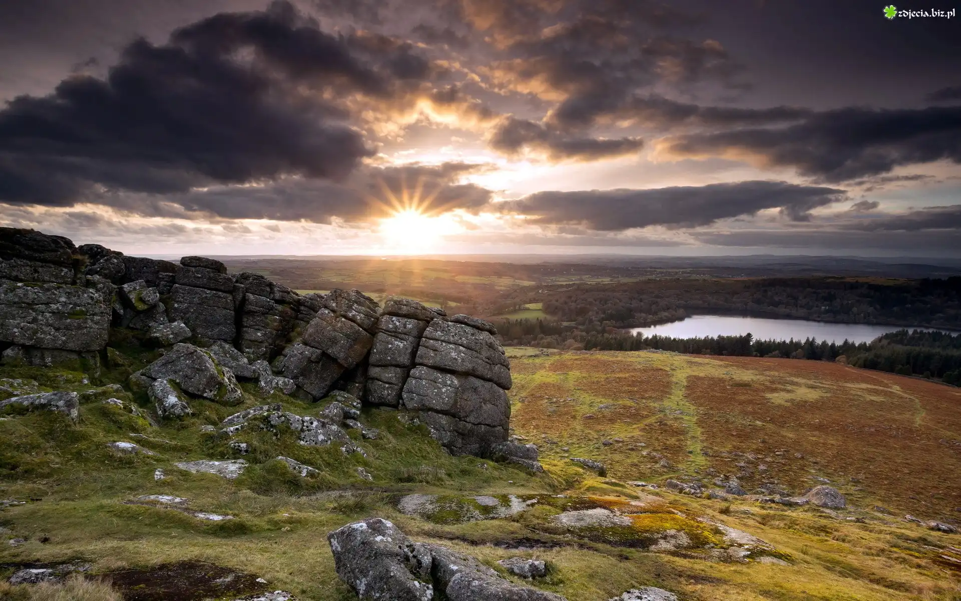 Zdjęcie Jezioro, Skały, Wschód, Słońca, Chmury, Trawa