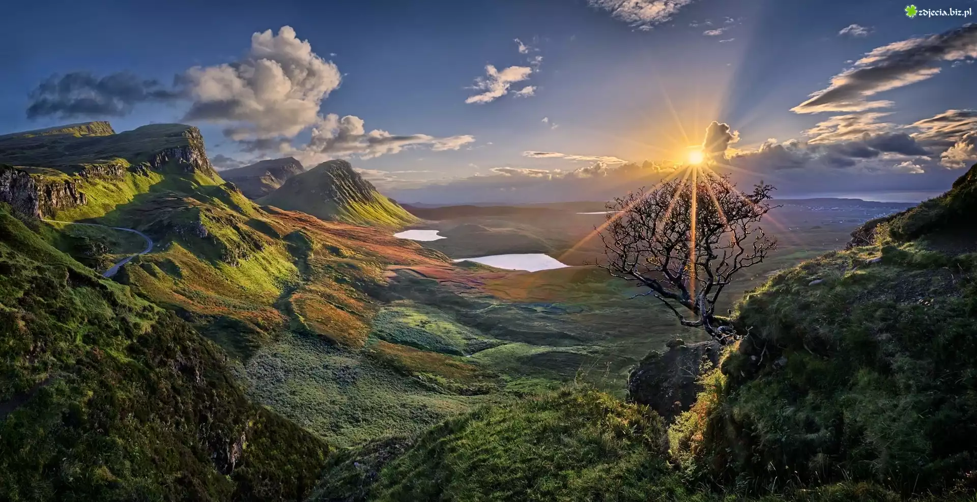Zdjęcie, Szkocja, Dolina, Wzgórza, Quiraing, Zachód słońca, Drzewo