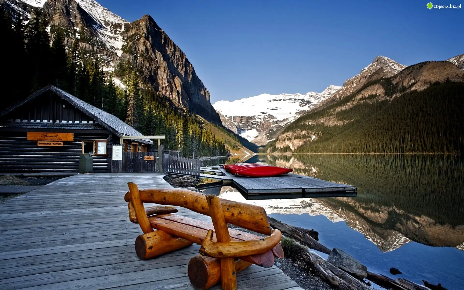 Zdjęcie Jezioro, Pomost, Ławka, Dom, Góry