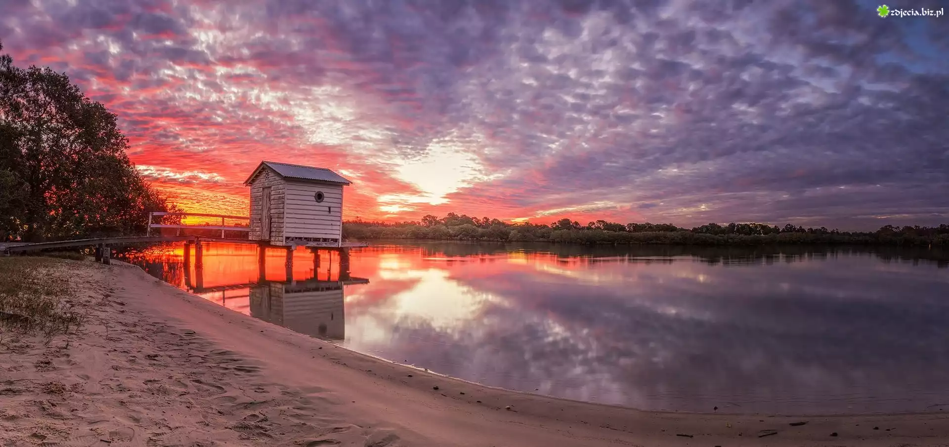 Zdjęcie Jezioro, Zachód słońca, Drzewa, Domek, Pomost