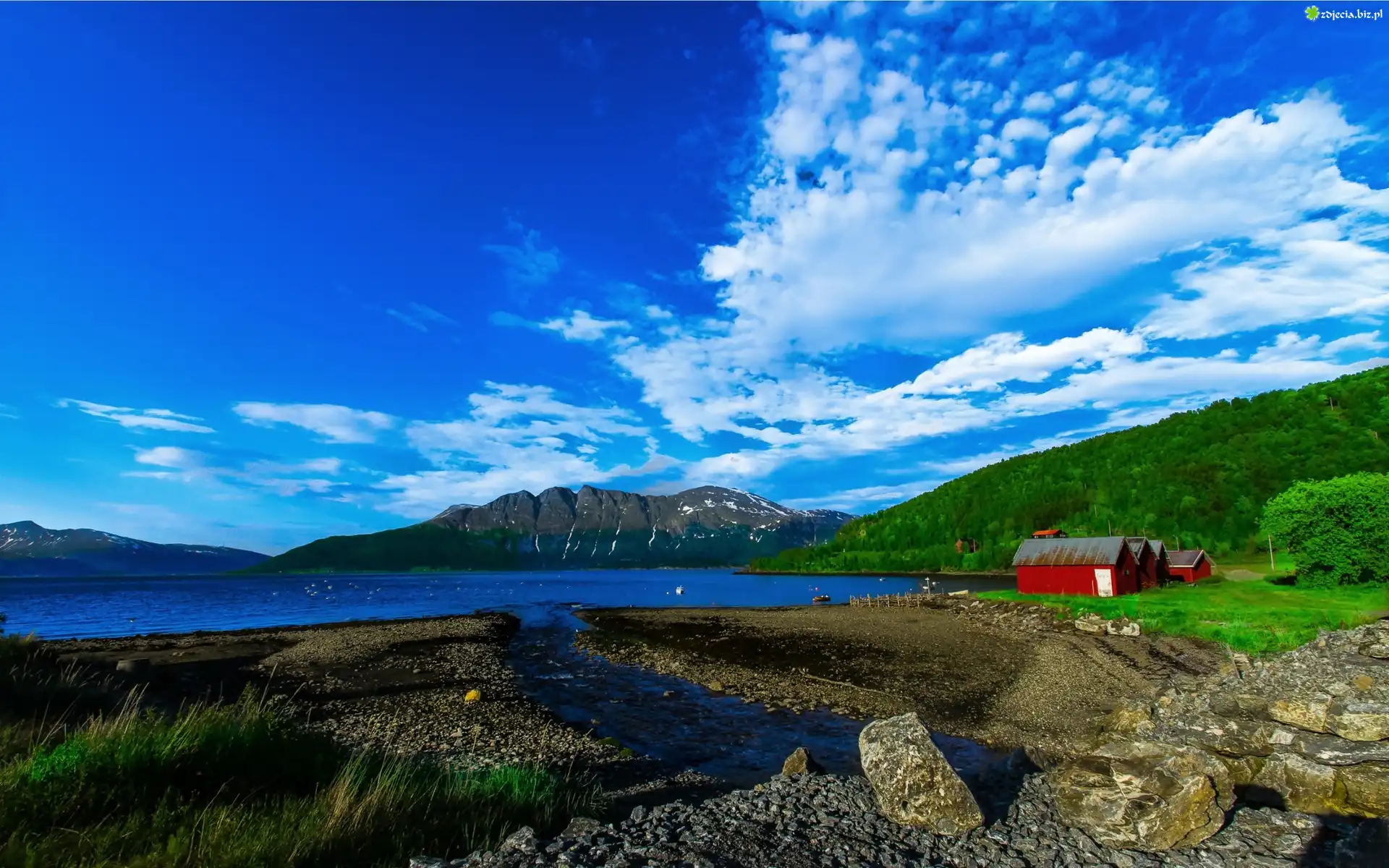 Zdjęcie Jezioro, Góry, Lasy, Domy, Norwegia