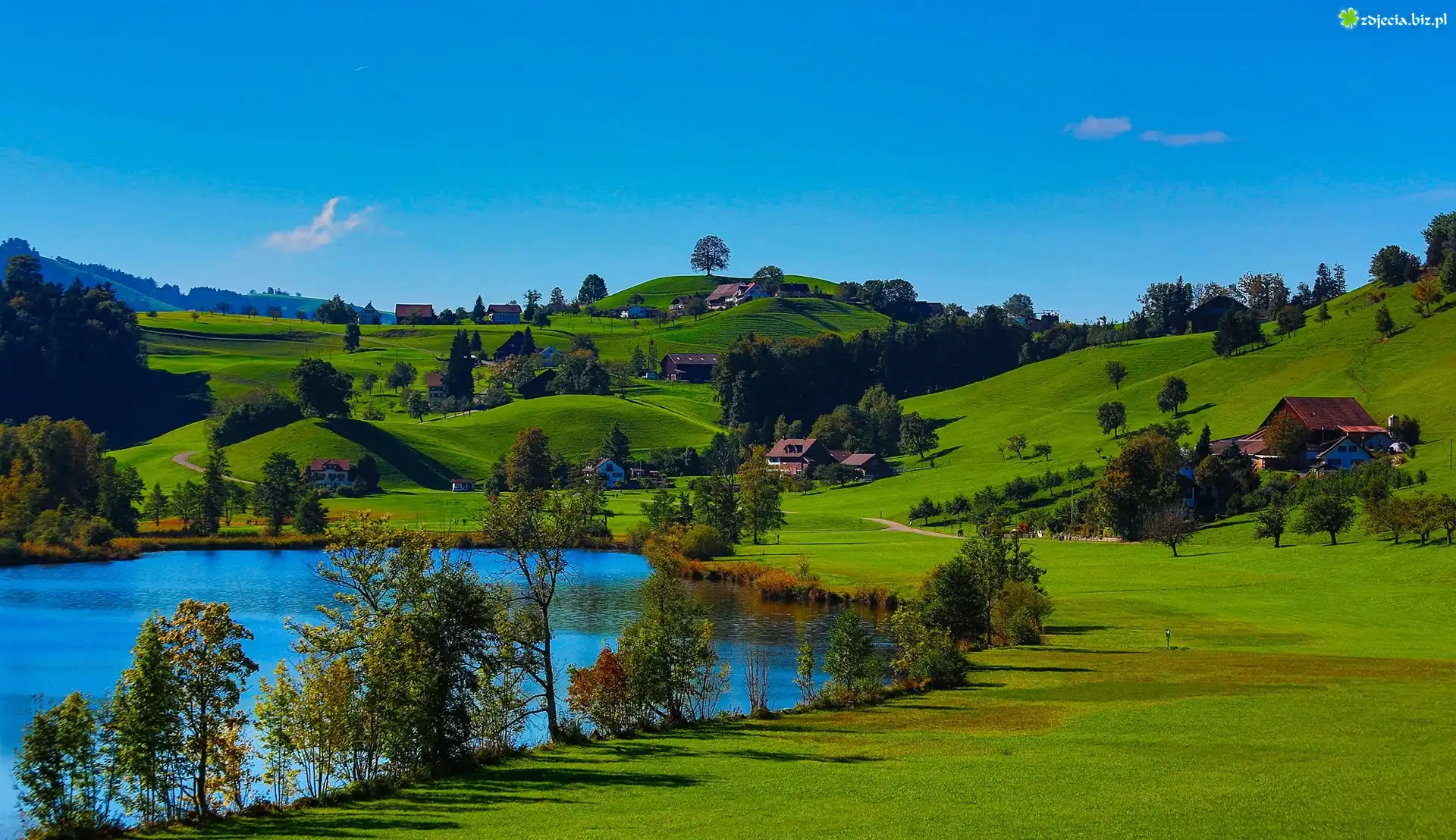 Zdjęcie Jezioro, Wzgórza, Domy, Wieś