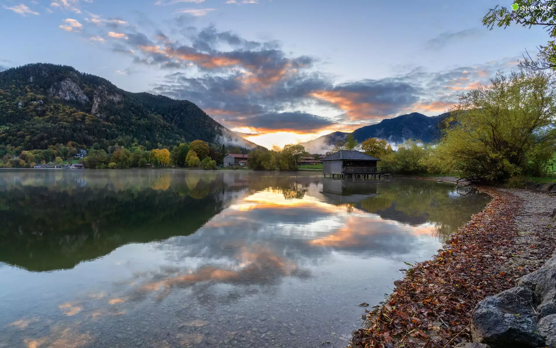 Zdjęcie Góry, Jezioro, Drzewa, Domy, Chmury