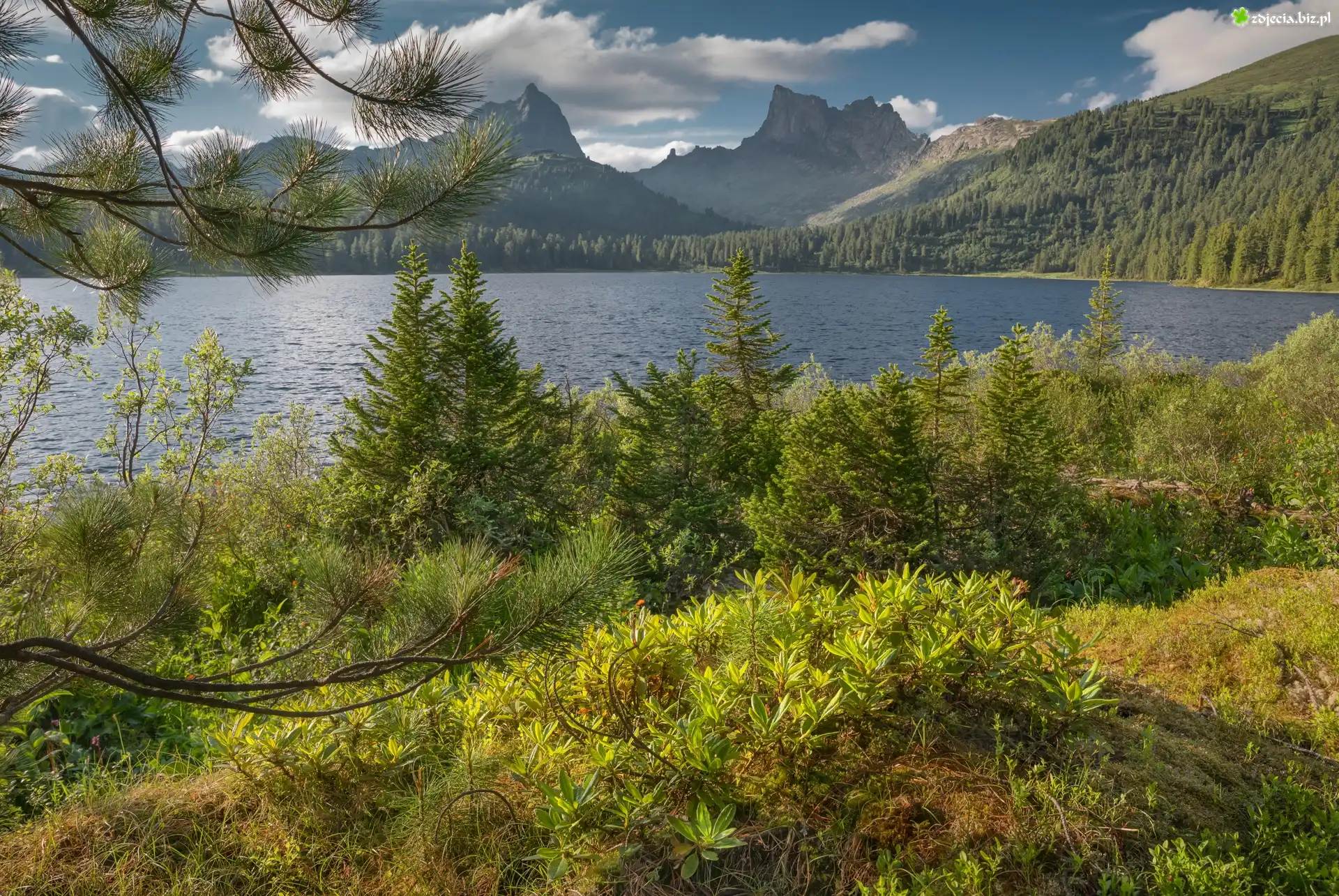 Zdjęcie, Jezioro, Góry, Chmury, Drzewa, Roślinność