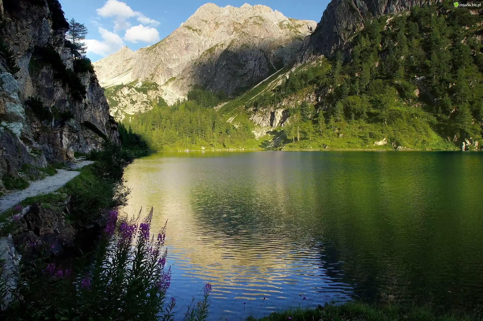 Zdjęcie, Jezioro, Góry, Drzewa, Iglaki