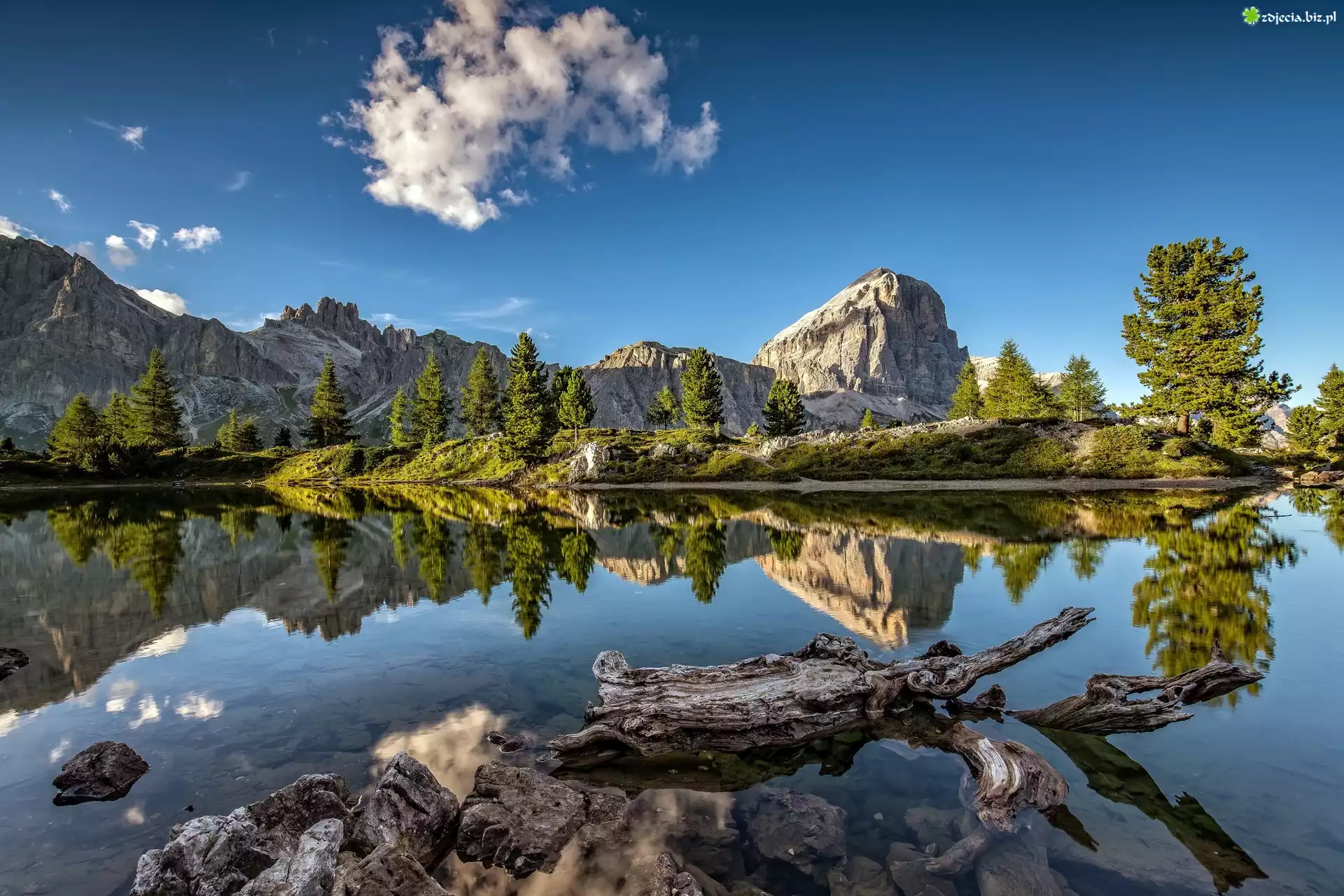 Zdjęcie, Jezioro, Góry, Drzewa, Kłoda