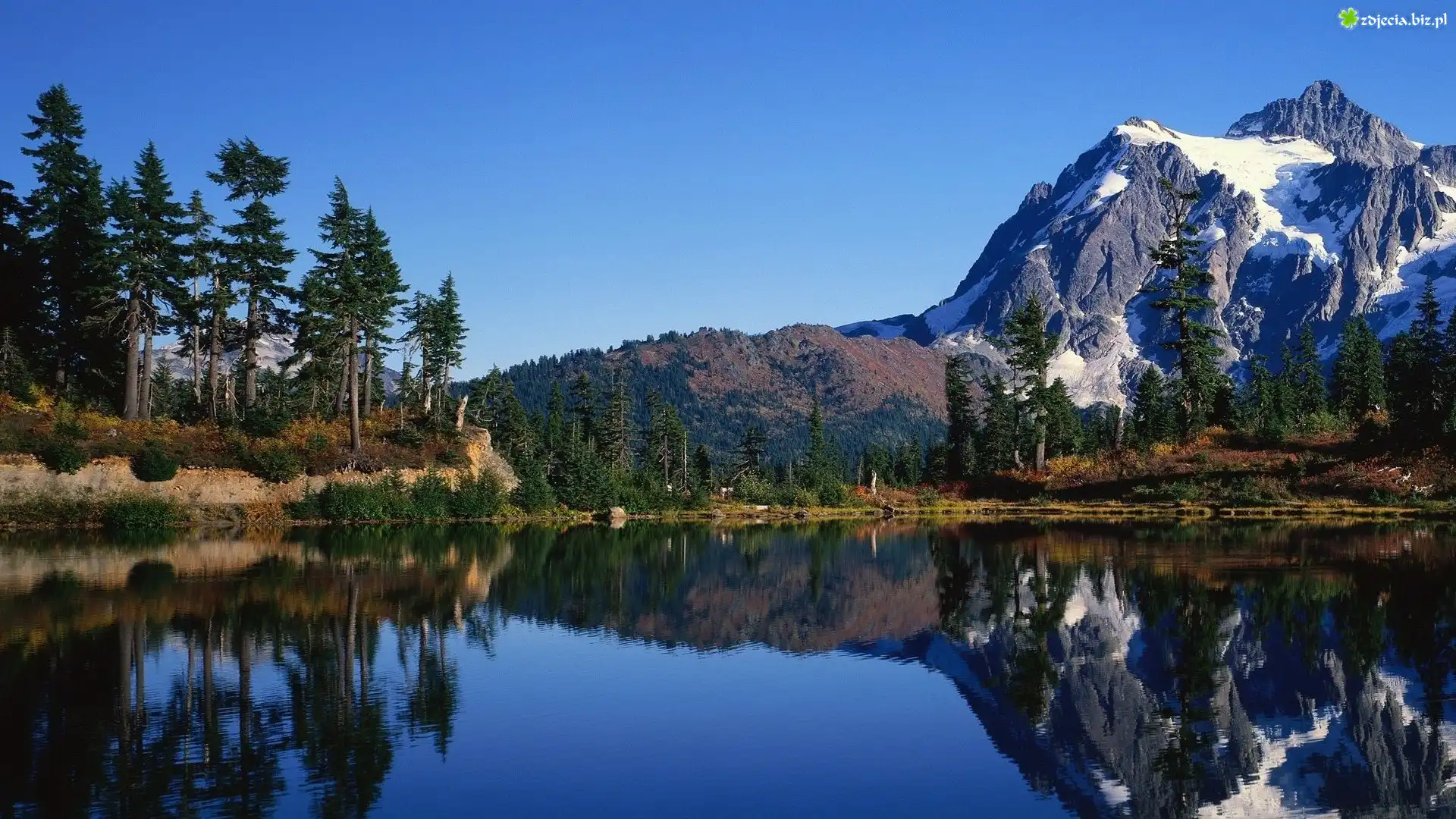 Zdjęcie Jezioro, Ośnieżone, Góry, Drzewa, Iglaki