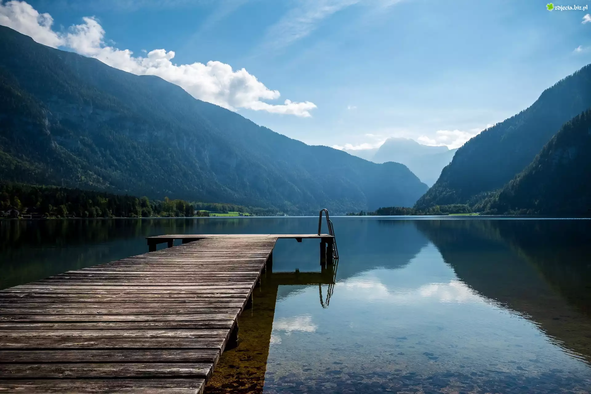 Zdjęcie Jezioro, Pomost, Góry, Drzewa, Chmury
