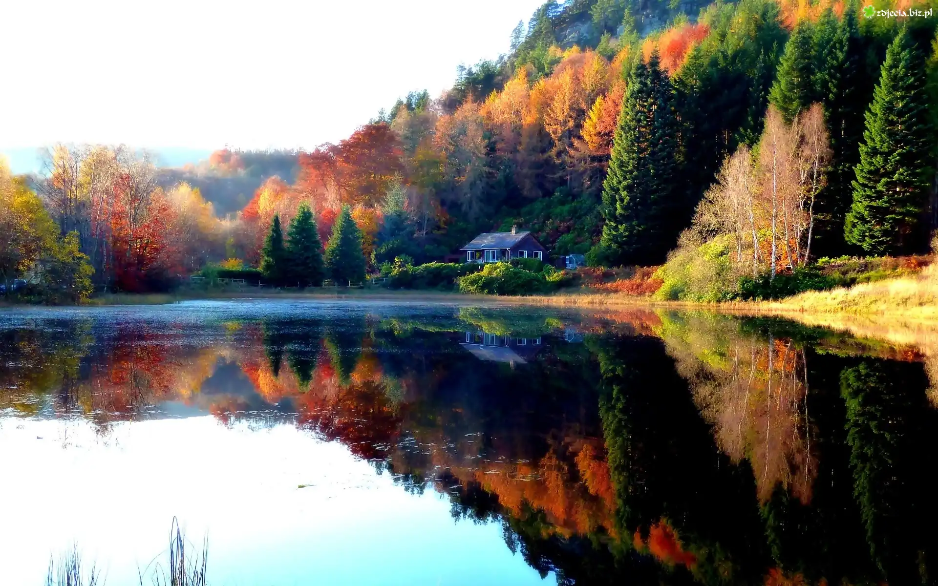 Zdjęcie Jezioro, Dom, Lasy, Kolorowe, Drzewa, Jesień