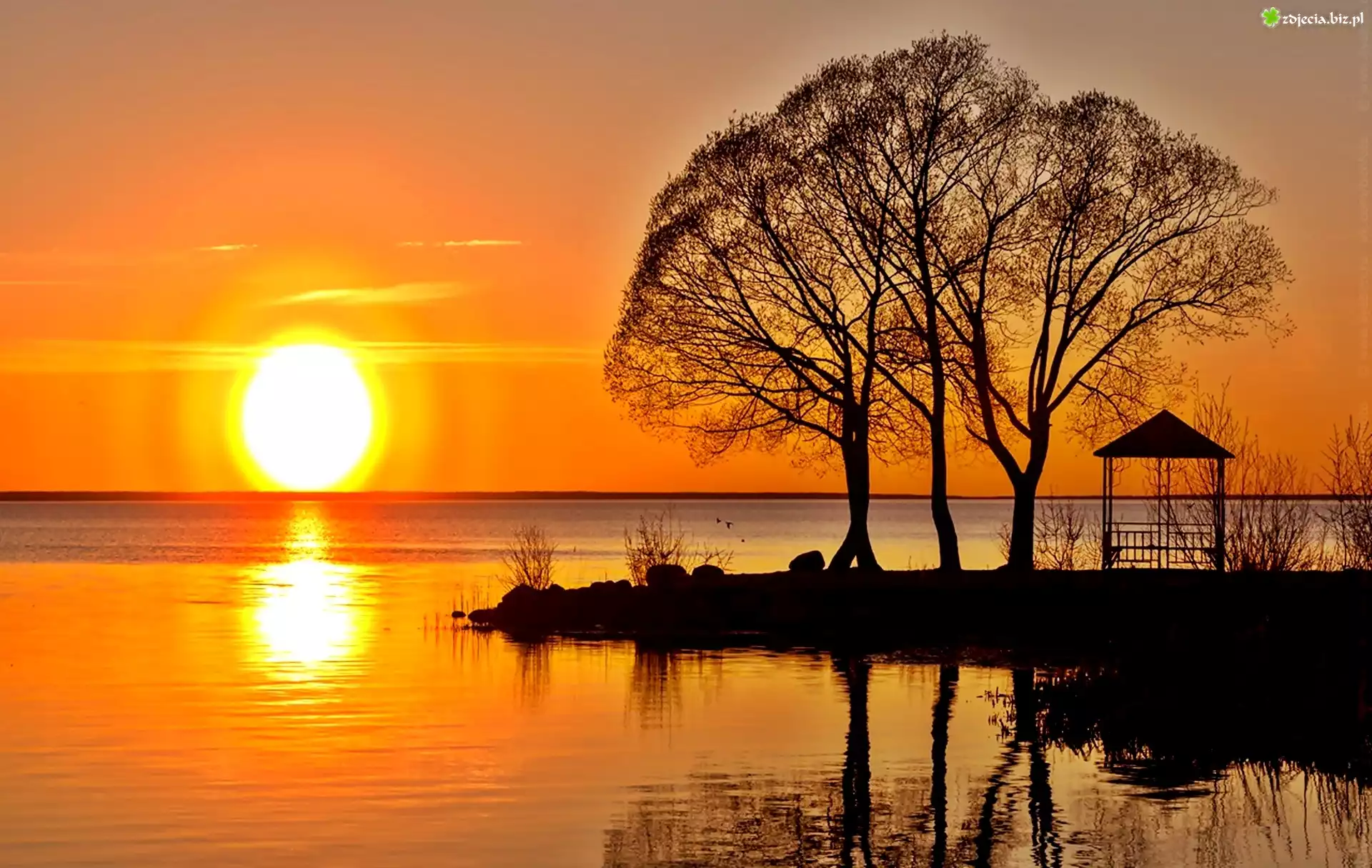 Zdjęcie Jezioro, Zachód, Słońca, Drzewa, Altanka