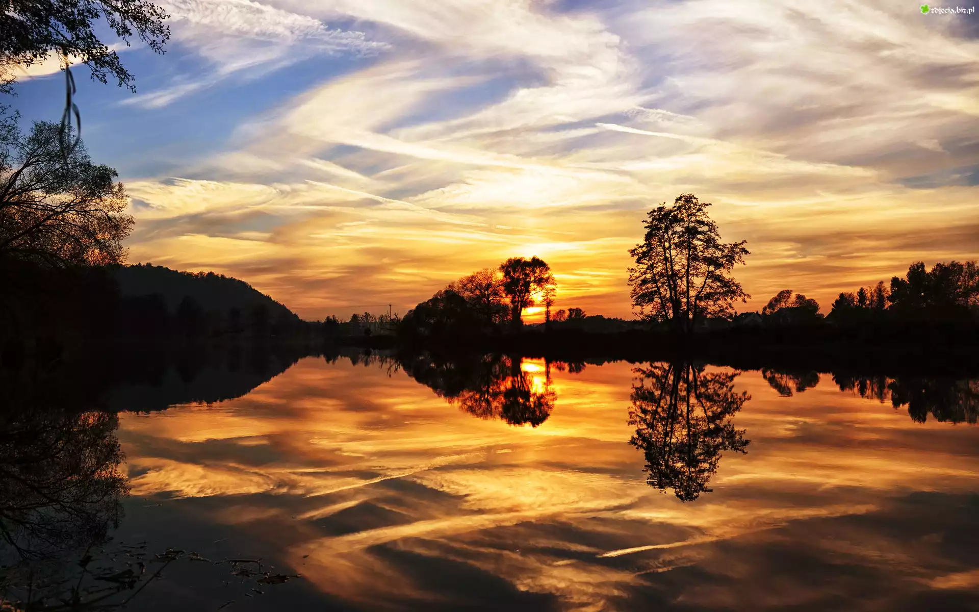 Zdjęcie Jezioro, Zachód słońca, Drzewa, Niebo