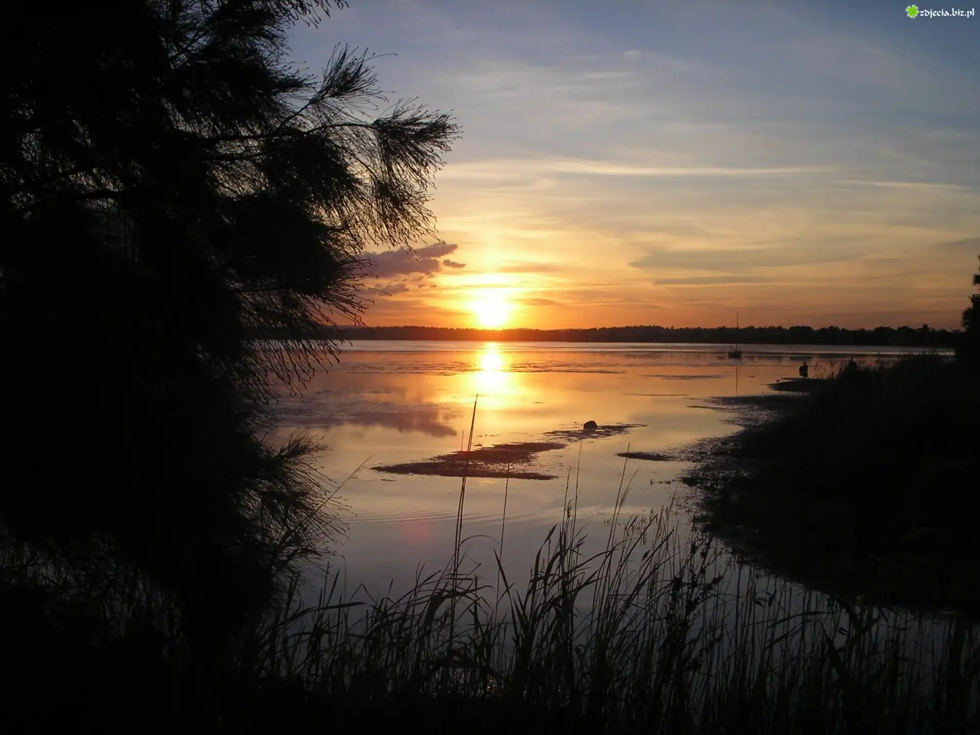 Zdjęcie, Jezioro, Zachód słońca, Drzewa, Roślinność