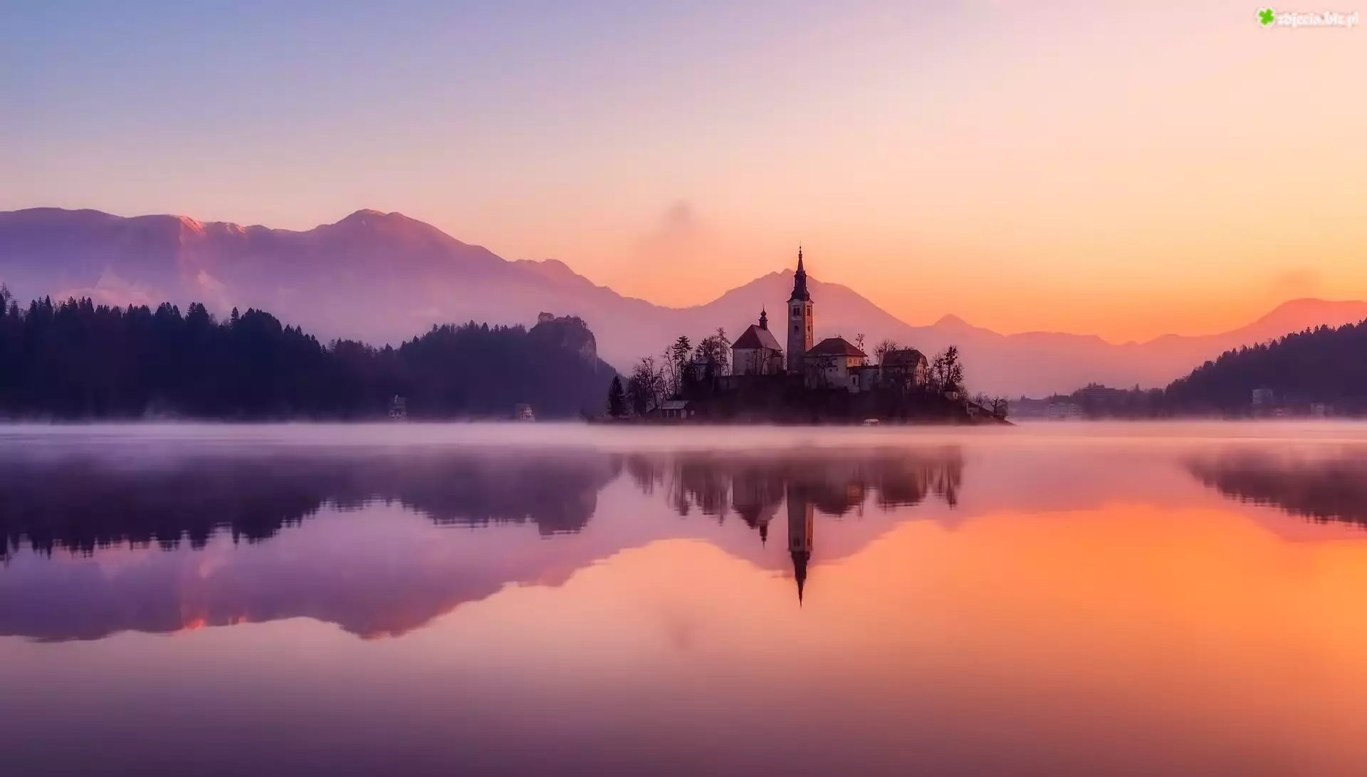 Zdjęcie Słowenia, Jezioro Bled, Wyspa Blejski Otok, Mgła, Drzewa