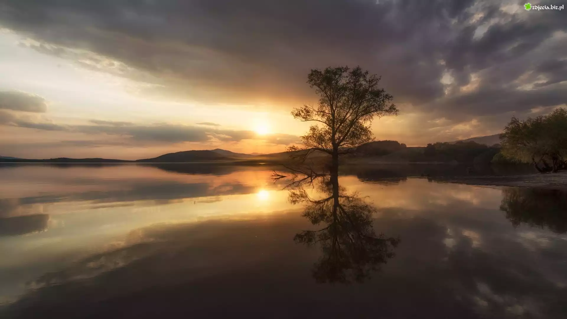 Zdjęcie Jezioro, Jesień, Zachód słońca, Drzewa, Odbicie