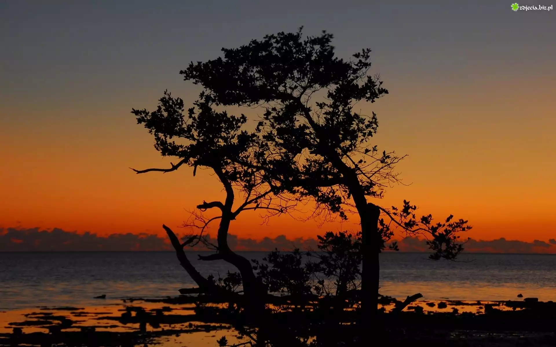 Zdjęcie Jezioro, Zachód, Słońca, Dwa, Drzewa