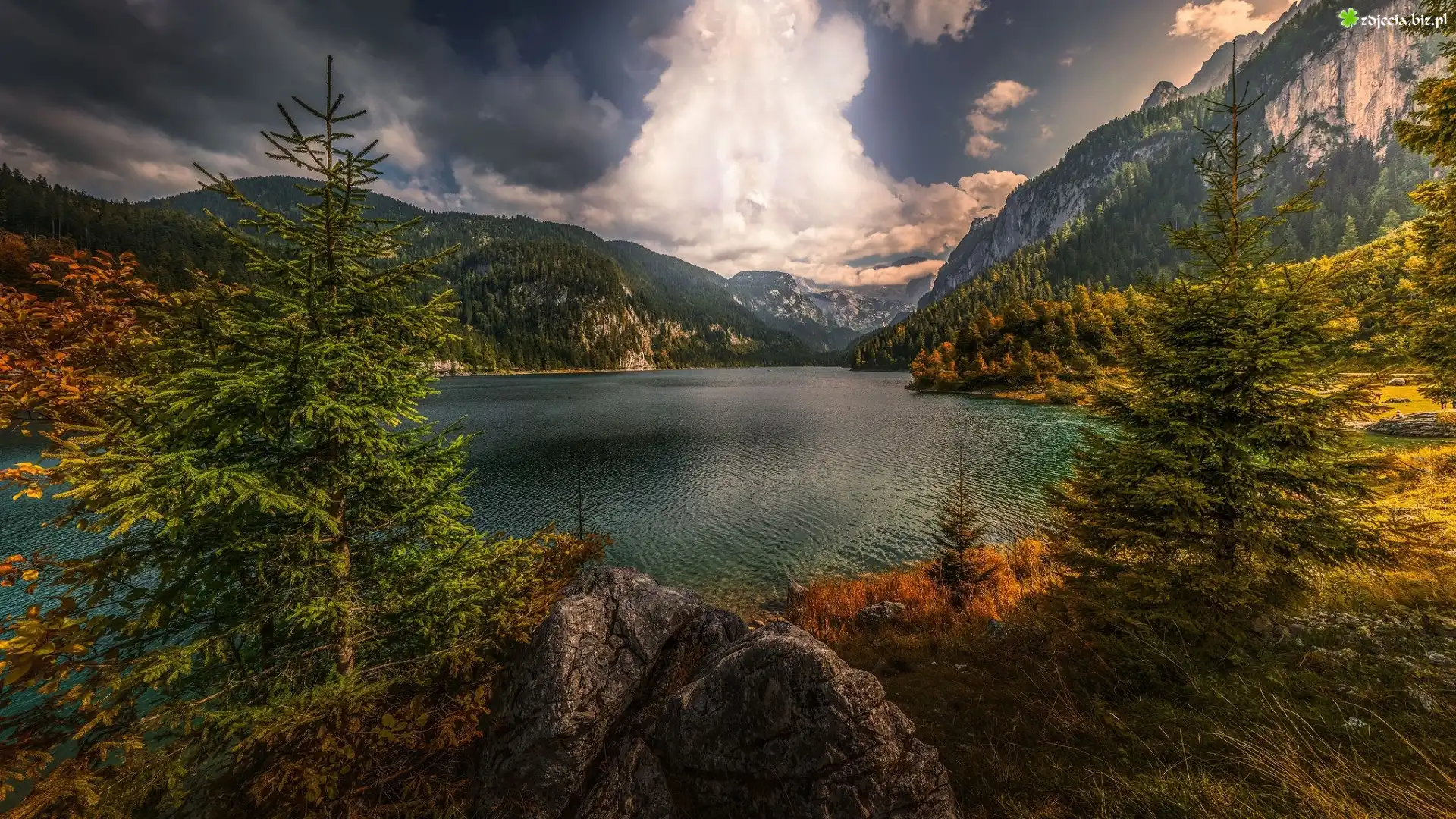Zdjęcie Góry, Skały, Drzewa, Świerki, Chmury, Jezioro Gosauseen, Alpy Salzburskie, Gmina Gosau, Austria |
