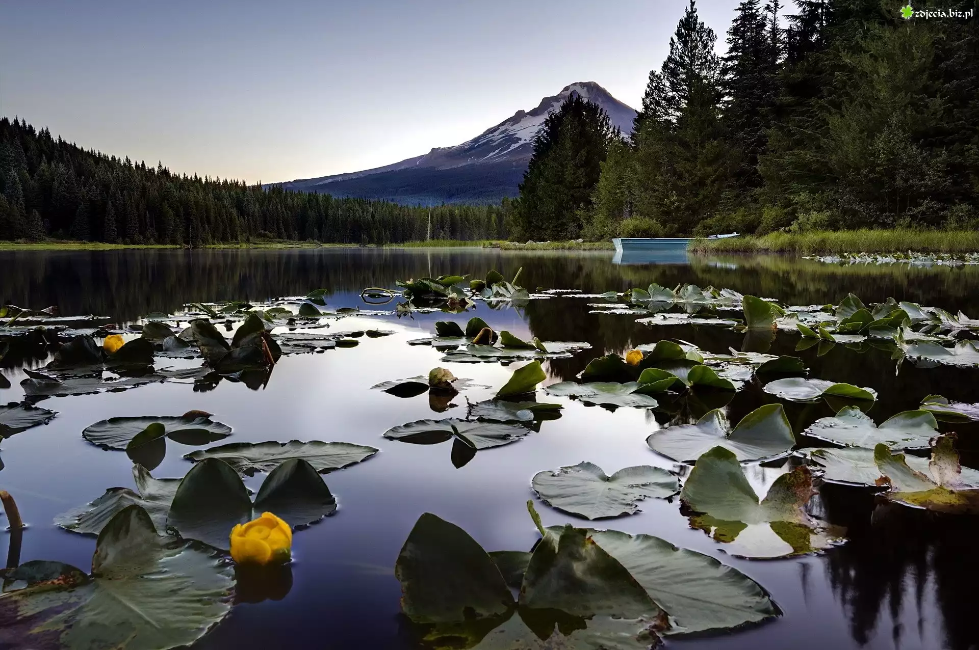 Zdjęcie Jezioro, Liście, Grążele, Łódka, Góry, Las