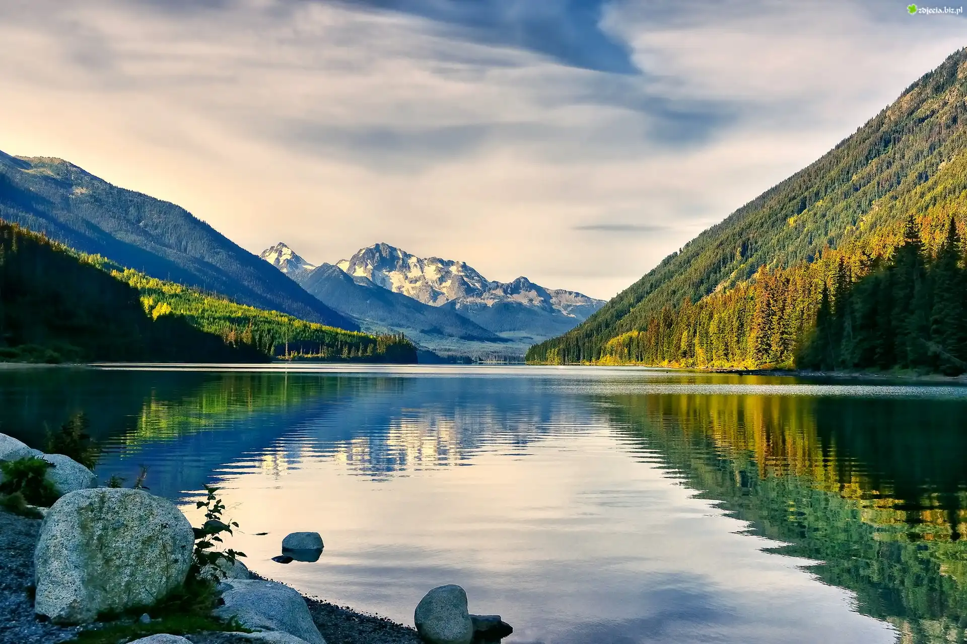 Zdjęcie Jezioro, Las, Iglasty, Góry, Kamienie
