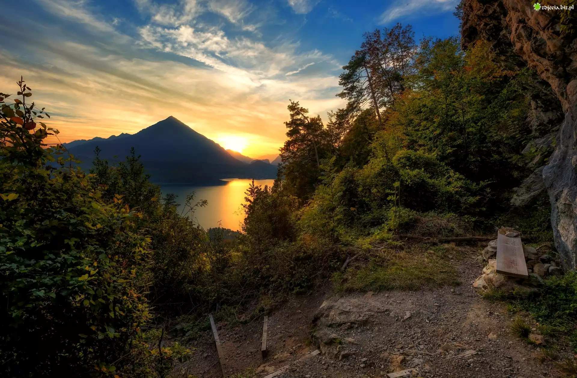 Zdjęcie Góry, Jezioro, Zachód słońca, Drzewa, Deska, Kamienie