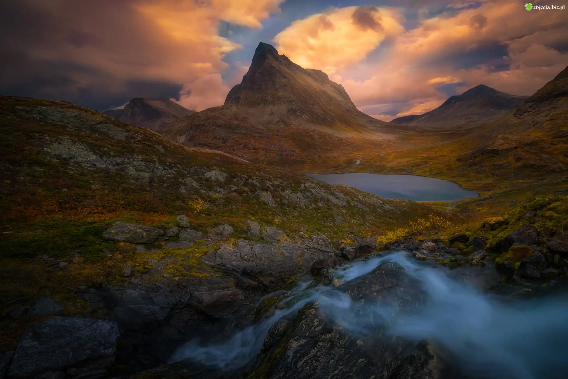 Zdjęcie, Góry, Jezioro, Rzeka, Chmury, Dolina Romsdalen, Norwegia
