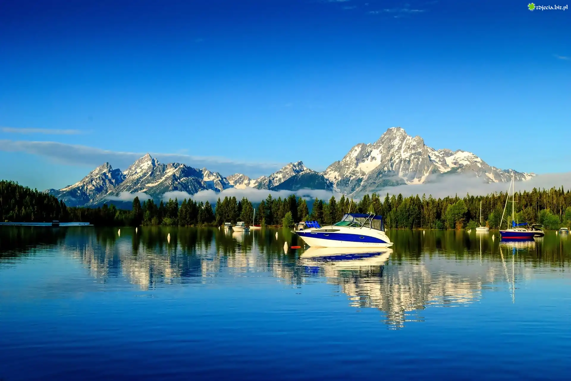 Zdjęcie Jezioro, Łodzie, Góry, Odbicie