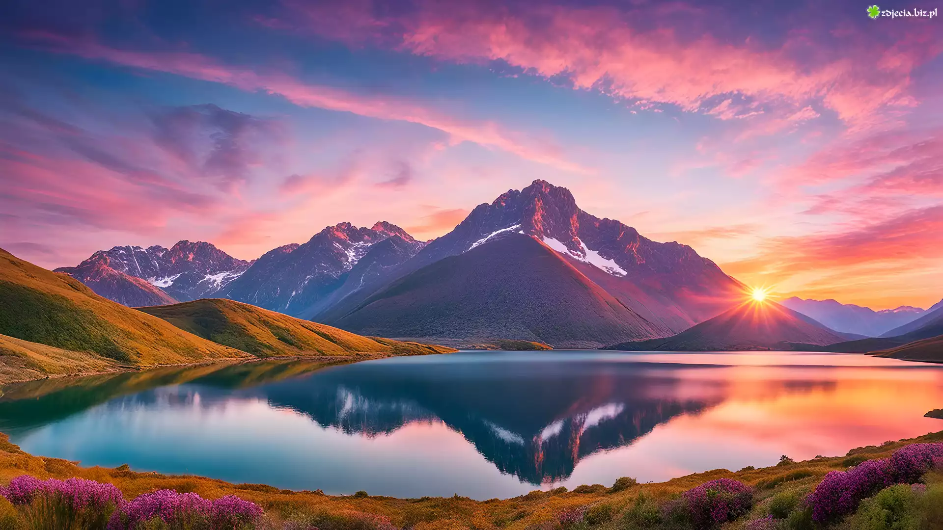 Zdjęcie Zachód słońca, Góry, Jezioro, Kwiaty, Kolorowe, Niebo
