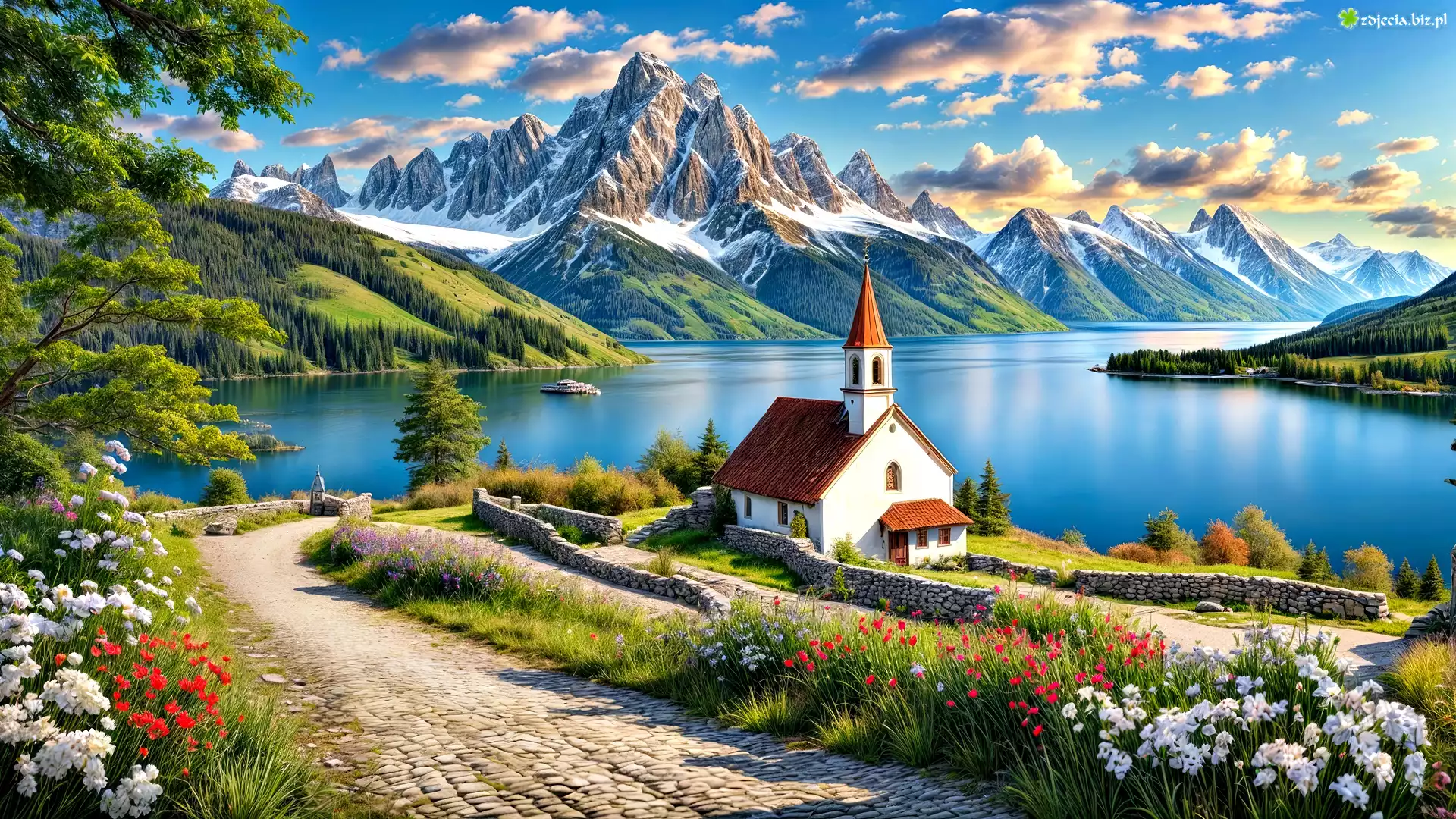 Zdjęcie Droga, Kwiaty, Kościół, Jezioro, Góry, Grafika