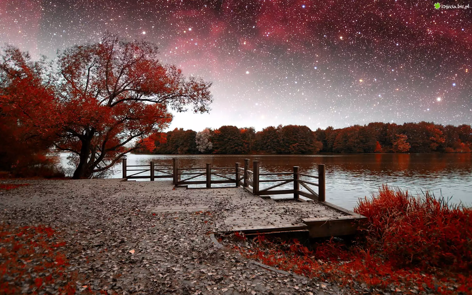 Zdjęcie Jezioro, Pomost, Gwiazdy, Drzewa