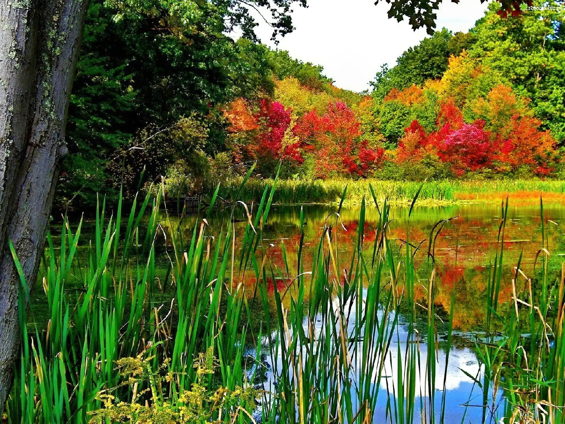 Zdjęcie Jezioro, Szuwary, Jesienne, Drzewa