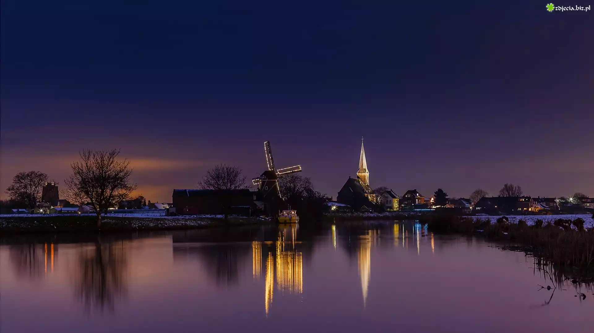 Zdjęcie Jezioro, Noc, Oświetlony, Kościół, Młyn