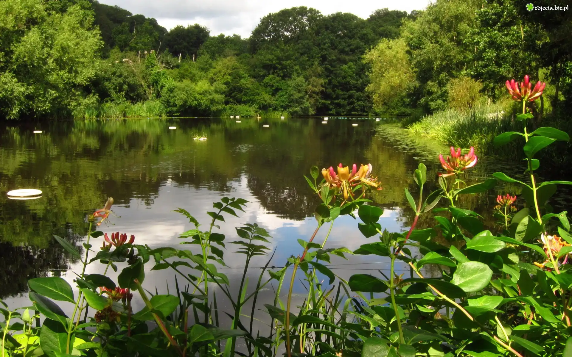 Zdjęcie Jezioro, Drzewa, Kwiaty, Trawy