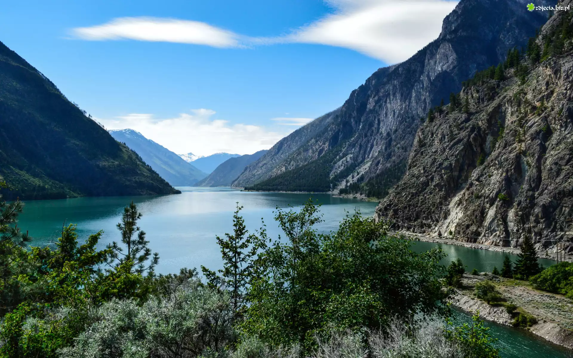 Zdjęcie Góry Nadbrzeżne, Jezioro, Seton Lake, Drzewa, Niebo, Lillooet, Kolumbia Brytyjska, Kanada |