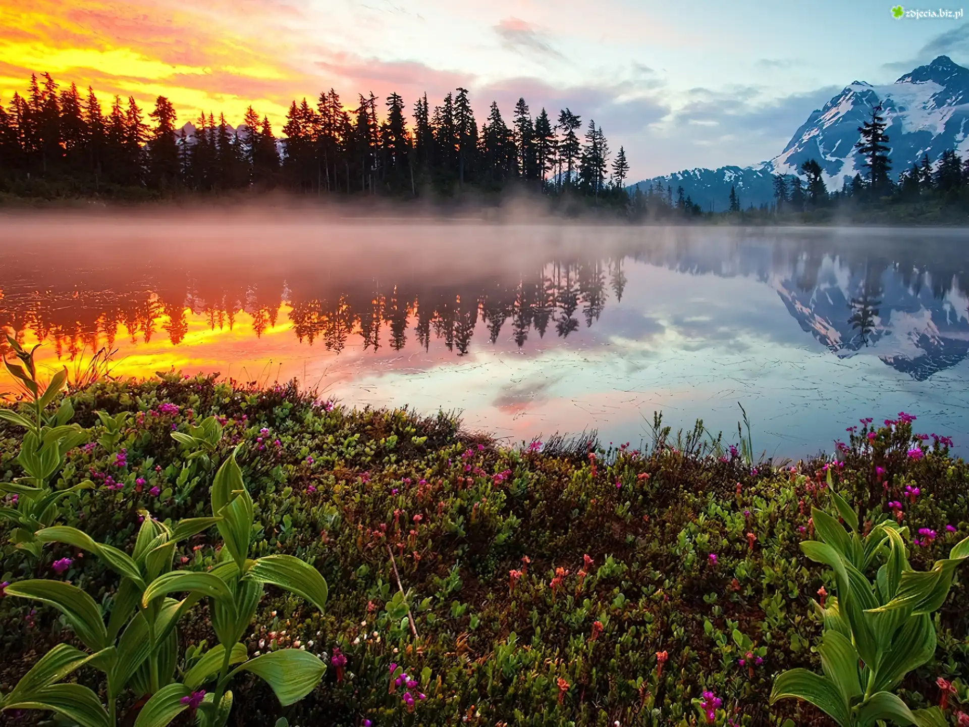 Zdjęcie Jezioro, Kwiaty, Las, Mgła